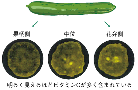 きゅうりに含まれるビタミンCを部位別に測定した結果、果実の真ん中(中位)から先端(花弁側)にかけて、また、種子の周りや果皮の内側に多く含まれていることがわかりました。