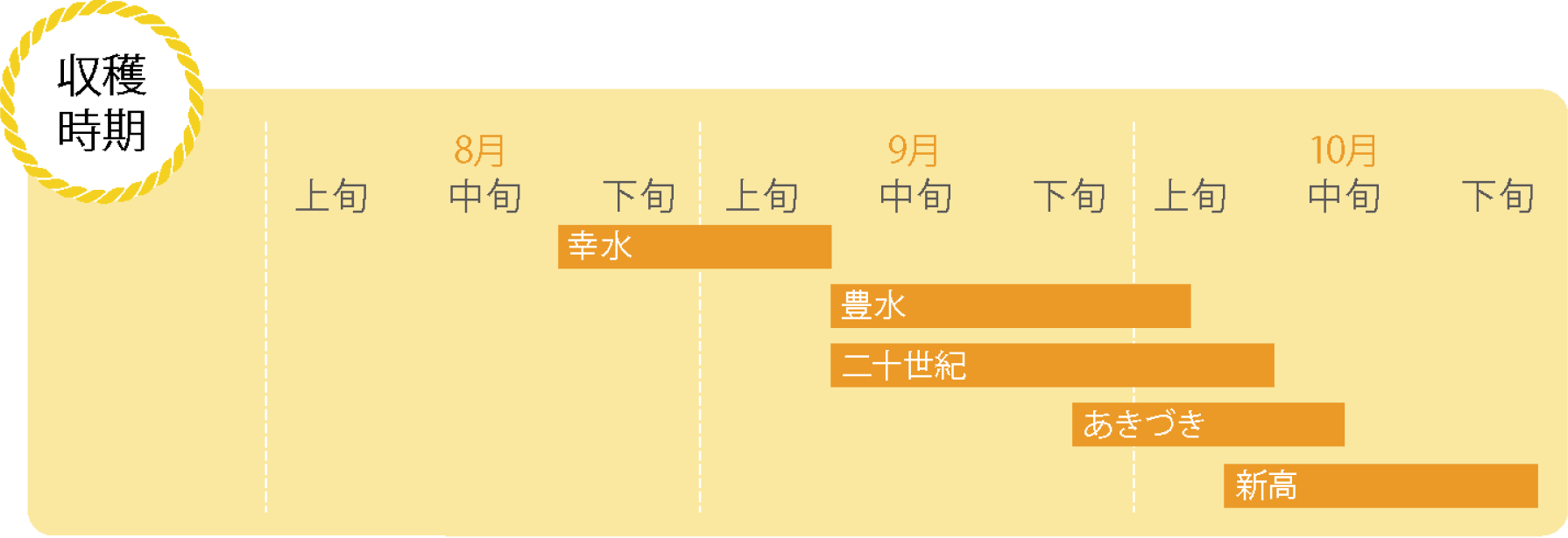 「幸水」の収穫に続く主力品種です。果実は大きく、甘みと酸味のバランスが絶妙で濃厚な食味を持ちます。「幸水」とは違ったおいしさをお楽しみください。歴史は古く、さわやかな甘さとみずみずしい食感で、根強い人気のある品種です。