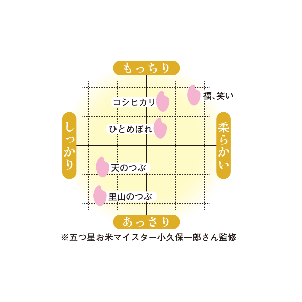 福島県のオリジナル品種です。県内の冷涼な里山で広く栽培される品種になって欲しいとの願いを込めて命名されました。粒張りが良く大粒で、しっかりとした食べ応えです。適度な粘りと旨みがありながらあっさりとした味わいです。